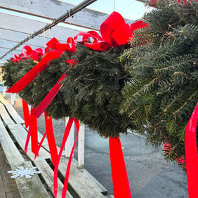 In addition to our wreaths, we handcraft traditional Northeastern decorations like kissing balls, available plain or adorned with velvet bows in various colors.